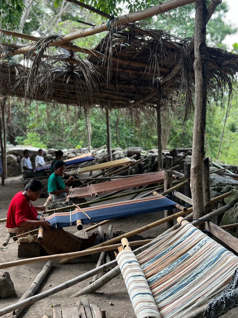 Nous arrivons au kampung accueillies par des petites mains qui s’agitent vers nous. Les enfants sont heureux de voir des visiteurs, surtout si ce sont des bule (étrangers). Ils s’assoient sur des tapis de feuilles tissées, au milieu de femmes de tout âge. Une petite structure de bois les protège de la pluie. Les femmes portent toutes l’ikat traditionnel. Leurs longs cheveux noirs sont attachées en un chignon bas. Ce style local est contrebalancé par leurs t-shirts à logo.