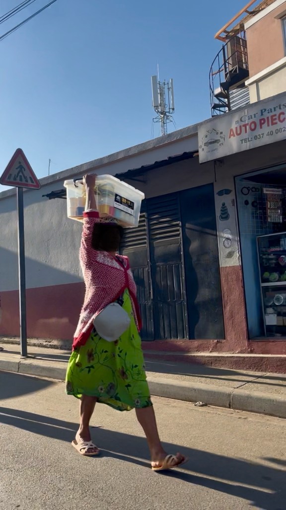Il serait bien trop long de s’étendre sur l’ensemble des accessoires qui habillent les Tananariviens : ceintures, bandeaux, gants, cagoules, etc. Ainsi, nous ne nous concentrerons que sur la catégories des sacs et autres contenants. Les sacs à dos sont courants — probablement dus à leur praticité : sacs de sport, sacs en cuir, sacs d’écolier, entre autres. Les sacs à main sont souvent tressés dans le raphia ou autres fibres végétales y ressemblant — dans un style qu’un œil novice comme le mien pourrait rapprocher à celui des chapeaux « bol » Betsileo. Il y a également tous les sacs de luxe copiés, vendus sans tabou de leur contrefaçon. Les paniers tressés de bandes de plastique colorées sont un autre accessoire courant, permettant notamment de transporter les trouvailles du marché. Une multitude d’autres contenants se baladent dans les rues de Tana — mais ceux-ci s’éloignent peut-être du vêtement.